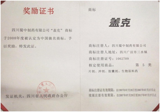 公司高度重视品牌战略,依法注册了“盖克”、“蜀中”、“三星堆”、“阿莫锋”、“益善源”、“蓉通”、“麻花豆传剧媒国产剧在线观看完整”等108件注册商标,1999年“盖克”、2003年“蜀中”、2007年“三星堆”被认定为德阳市知名商标,2001年“盖克”、2004年“蜀中”被认定为四川省著名商标, 2008年“盖克”商标被国家工商行政管理总局认定为“中国驰名商标”。2017年3月,公司盖克牌、麻花豆传剧媒国产剧在线观看完整牌阿莫西林胶囊和多酶片被四川省人民政府授予四川名牌产品称号。2016年,公司实现营业收入66373万元,利税7600万元;2017年,公司实现营业收入75045万元,利税7572万元。公司2017年被命名为德阳市第七批院士专家工作站,2016-2018连续三年被德阳市人民政府确定为重点龙头企业。